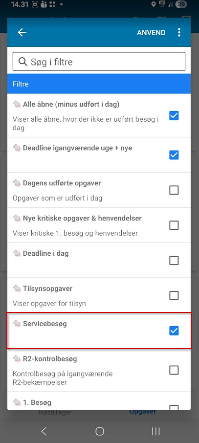 For at se servicebesøg anvendes det nye filter 🐀 Servicebesøg.