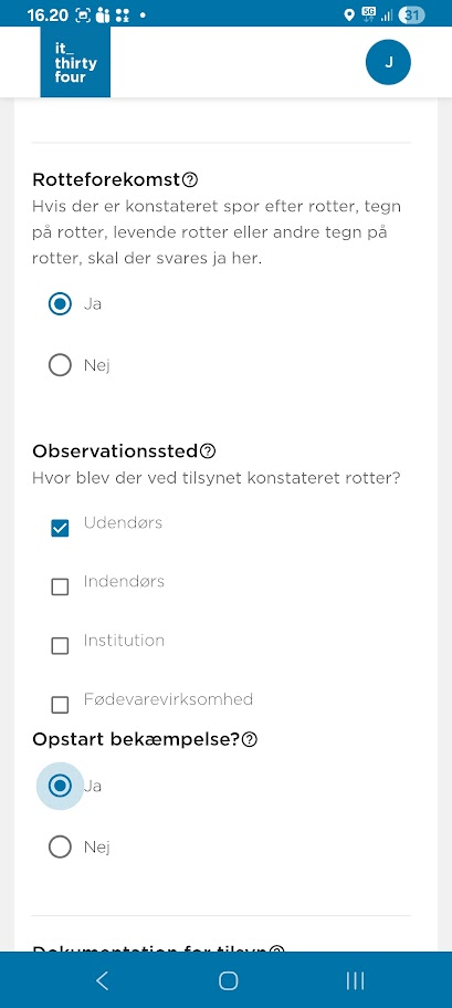 Hvis der på besøget konstateres forekomst af rotter kan en bekæmpelsessag skabes ved at svare Ja til Rotteforekomst og Opstart bekæmpelse?.