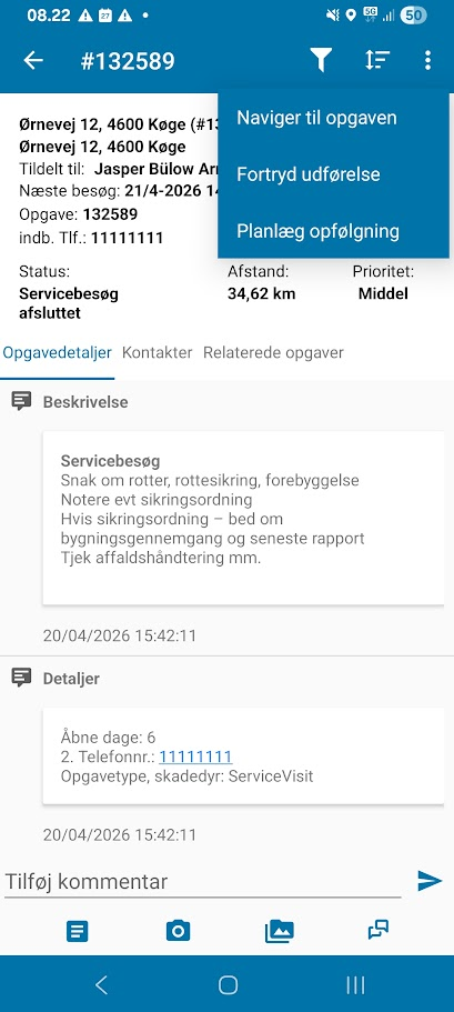 Hvis man ved en fejl har udført servicebesøget kan man genåbne en afsluttet opgave med handlingen Fortryd udførelse.