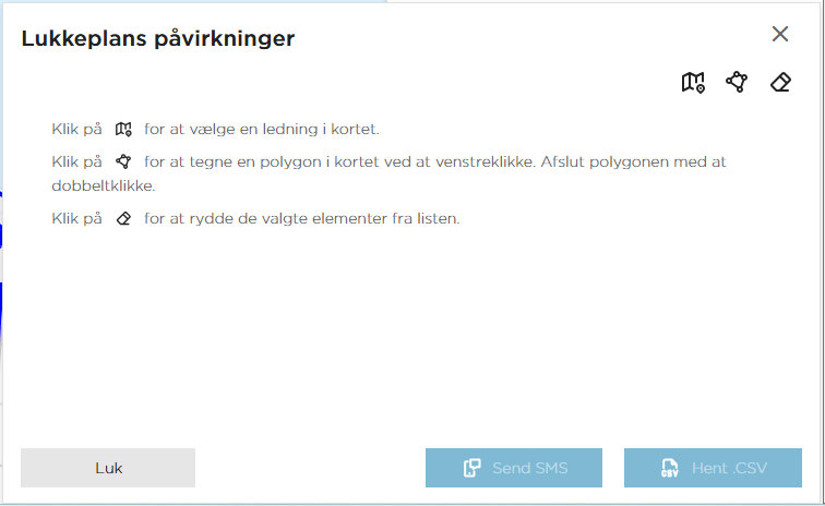 Værktøjet Lukkeplan bruges til at finde de adresser, som bliver påvirket af, at forsyningen lukker for vandet/varmen. Det kan enten være ved akut brud eller fordi man har behov for reparation i et område.